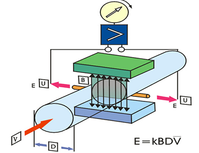 工業(yè)用水流量計(jì)工作原理是法拉*電磁感應(yīng)定律,即導(dǎo)體在磁場(chǎng)中切割磁力線運(yùn)動(dòng)時(shí),在導(dǎo)體兩端會(huì)感應(yīng)一個(gè)與磁場(chǎng)方向和導(dǎo)體運(yùn)動(dòng)方向相互垂直的感應(yīng)電動(dòng)勢(shì)。感應(yīng)電動(dòng)勢(shì)的大小與感應(yīng)強(qiáng)度和運(yùn)動(dòng)速度成正比。導(dǎo)電性液體在垂直于磁場(chǎng)的非磁性測(cè)量管內(nèi)流動(dòng),與流動(dòng)方向垂直的方向上產(chǎn)生與流量成比例的感應(yīng)電勢(shì),其值如下式: